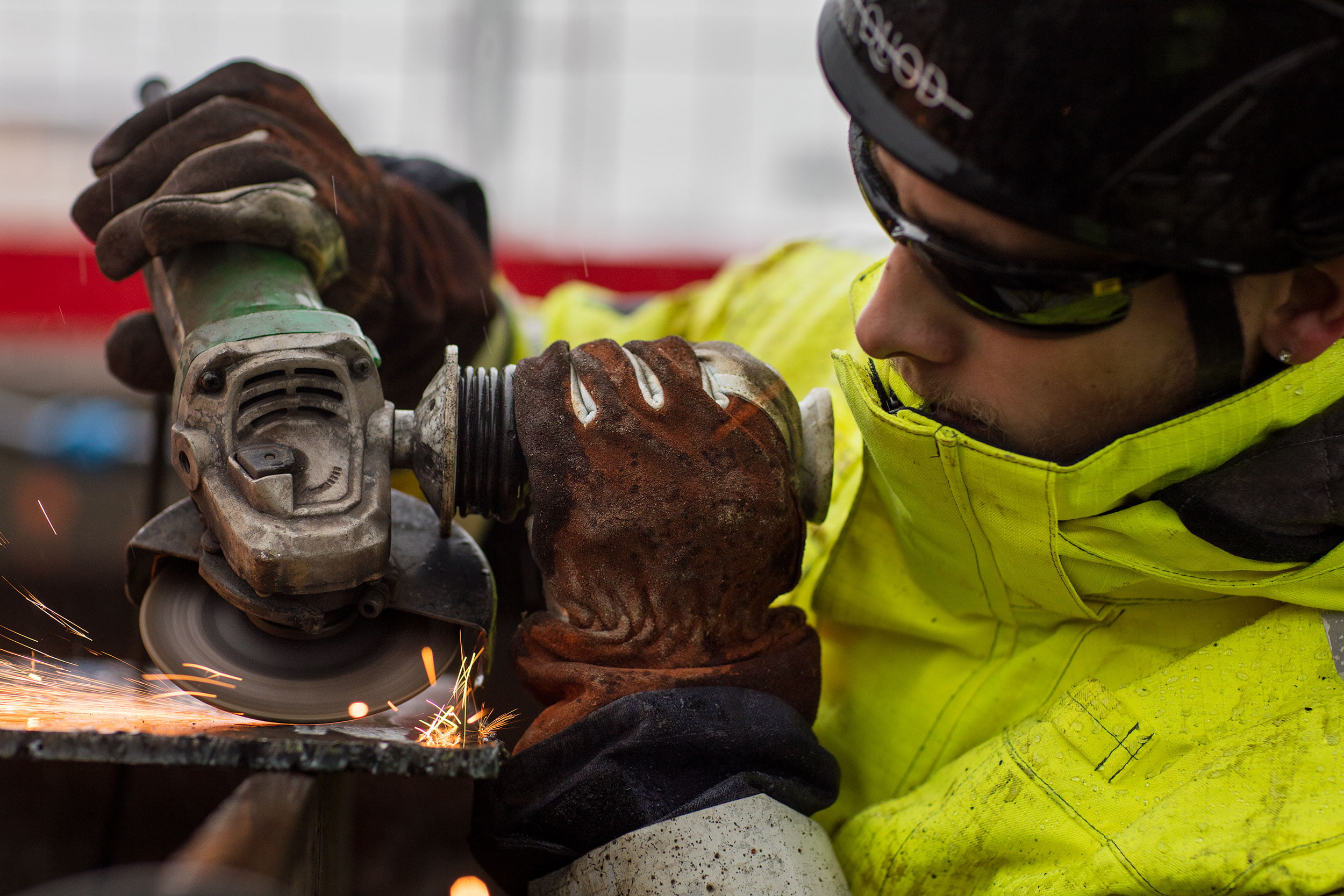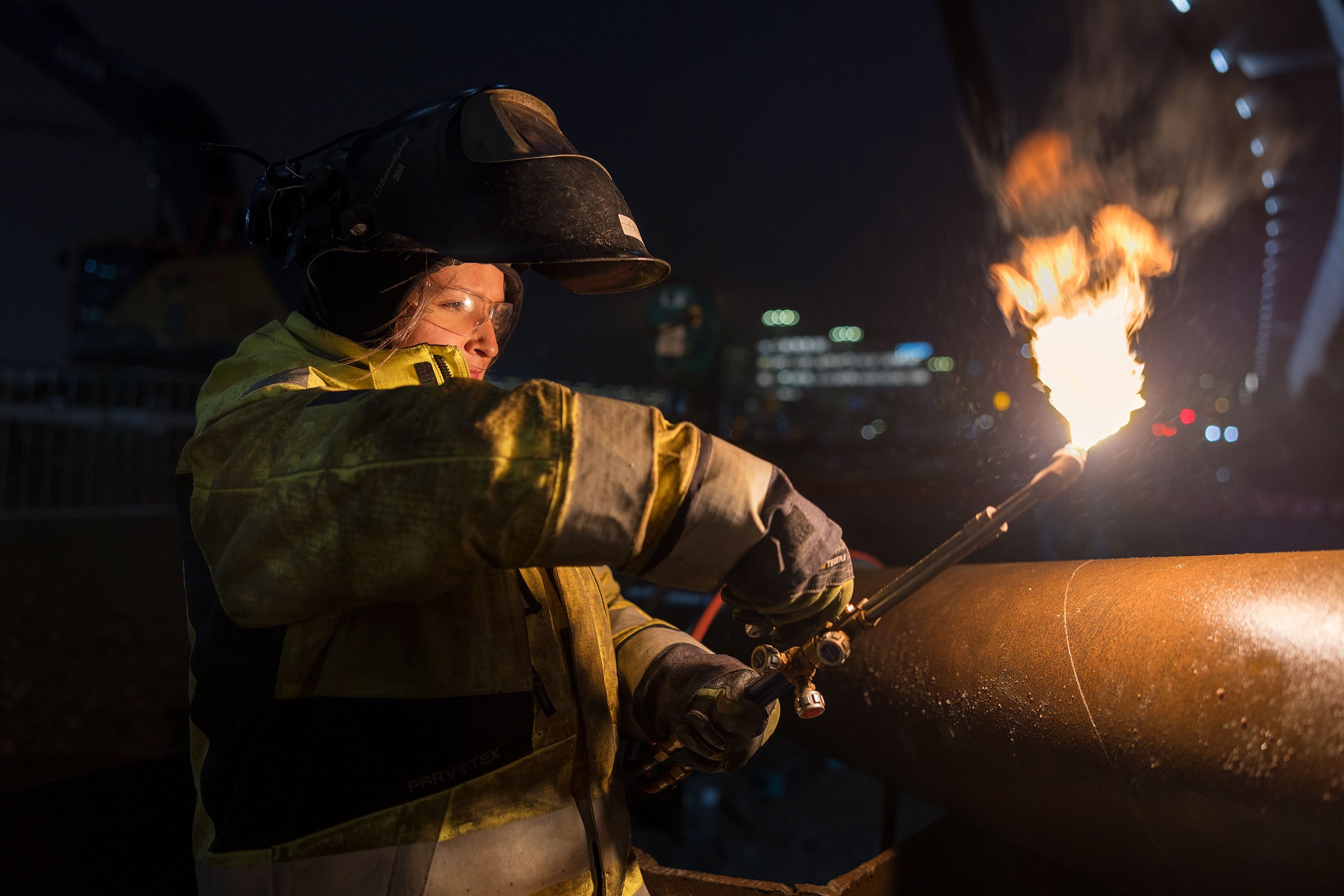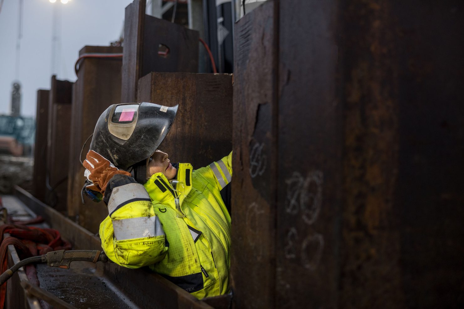 Kun he saapuvat perille, on jälleen maanantaisen palaverin aika, ja he saavat työmaapäälliköltä ohjeet. Sen jälkeen he menevät työkohteisiin. Hitsaus alkaa. He kumartuvat liekin päälle ja katsovat tarkasti hitsaussuojan läpi.