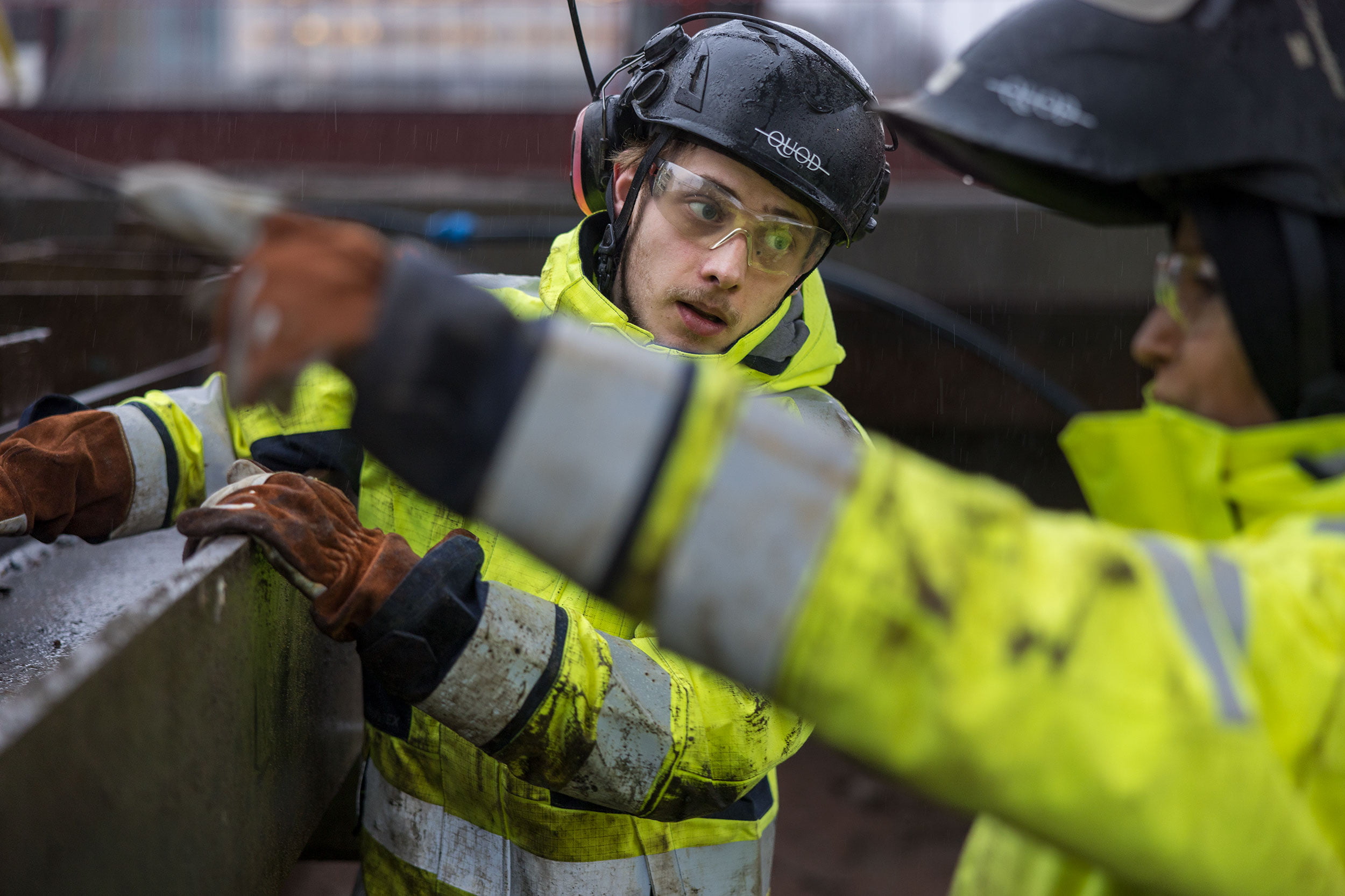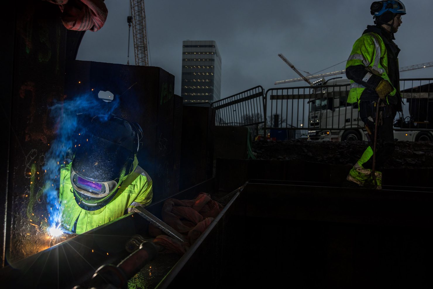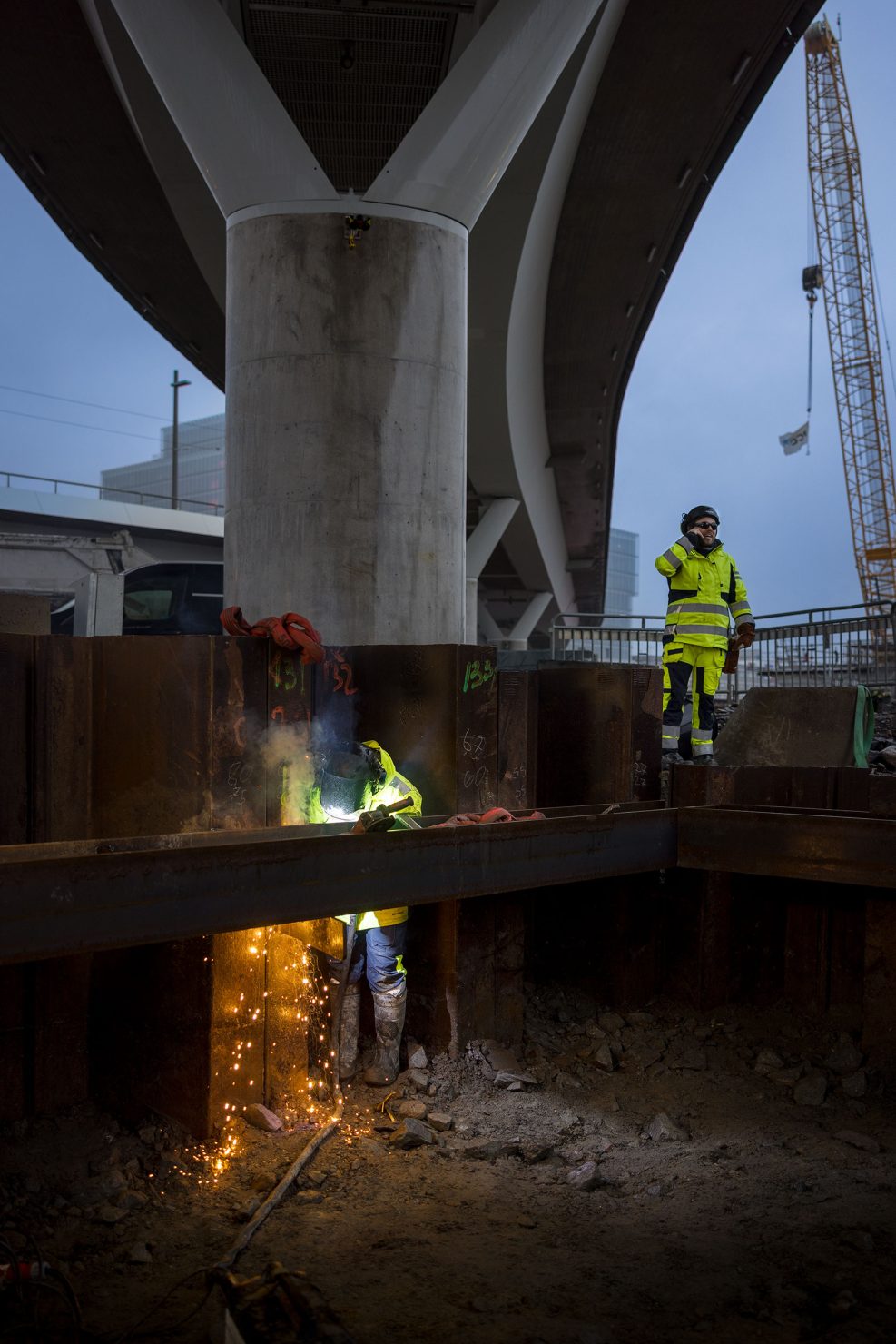 Tarkastajat tulevat usein tarkistamaan, että kaikki hitsaukset ovat kunnossa. Kukaan ei halua, että tukiseinä romahtaa. Turvallisuusajattelu näin suurella työmaalla on järjestelmällistä ja korkealla tasolla, ja Quodin hitsaajilla on siinä erittäin tärkeä tehtävä. Heidän työnsä ansiosta muut rakentajat, kuten kaivinkoneiden kuljettajat, raudoittajat ja paaluttajat, voivat työskennellä työmaalla turvallisesti.