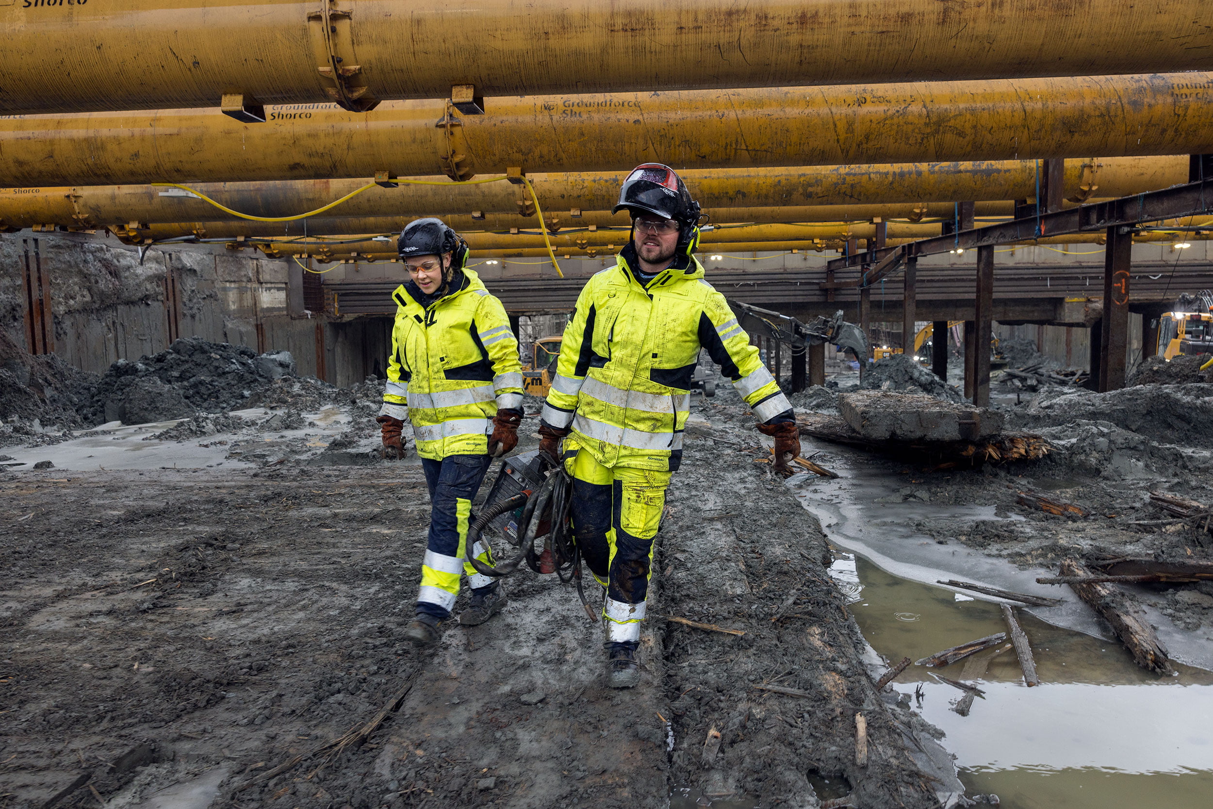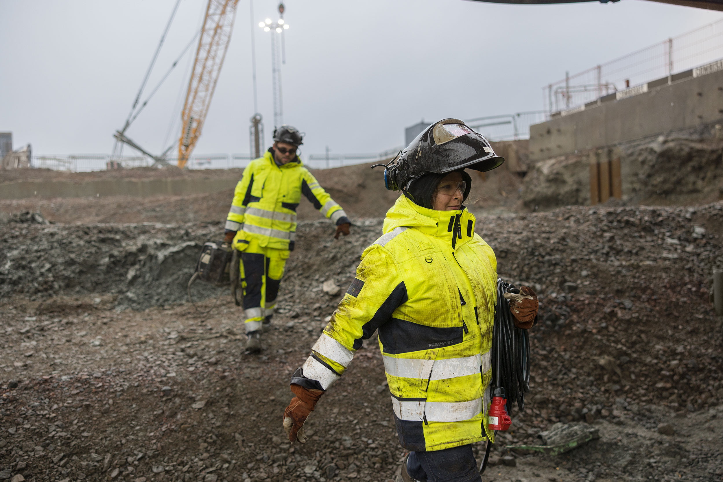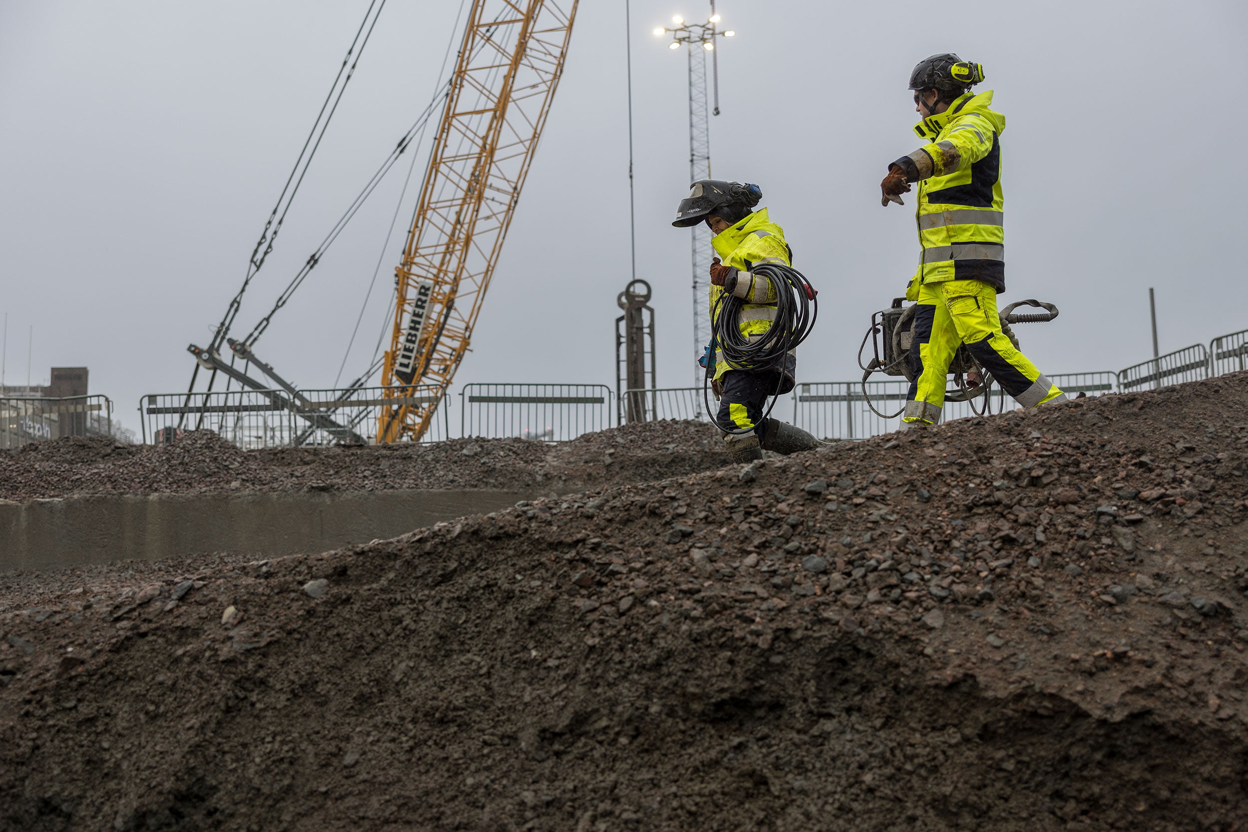 Matkalla tämän jättimäisen rakennustyömaan läpi he ohittavat kaivinkoneita, suuria nostureita ja rakennustyöntekijöitä, jotka ovat pukeutuneet huomiovaatteisiin.