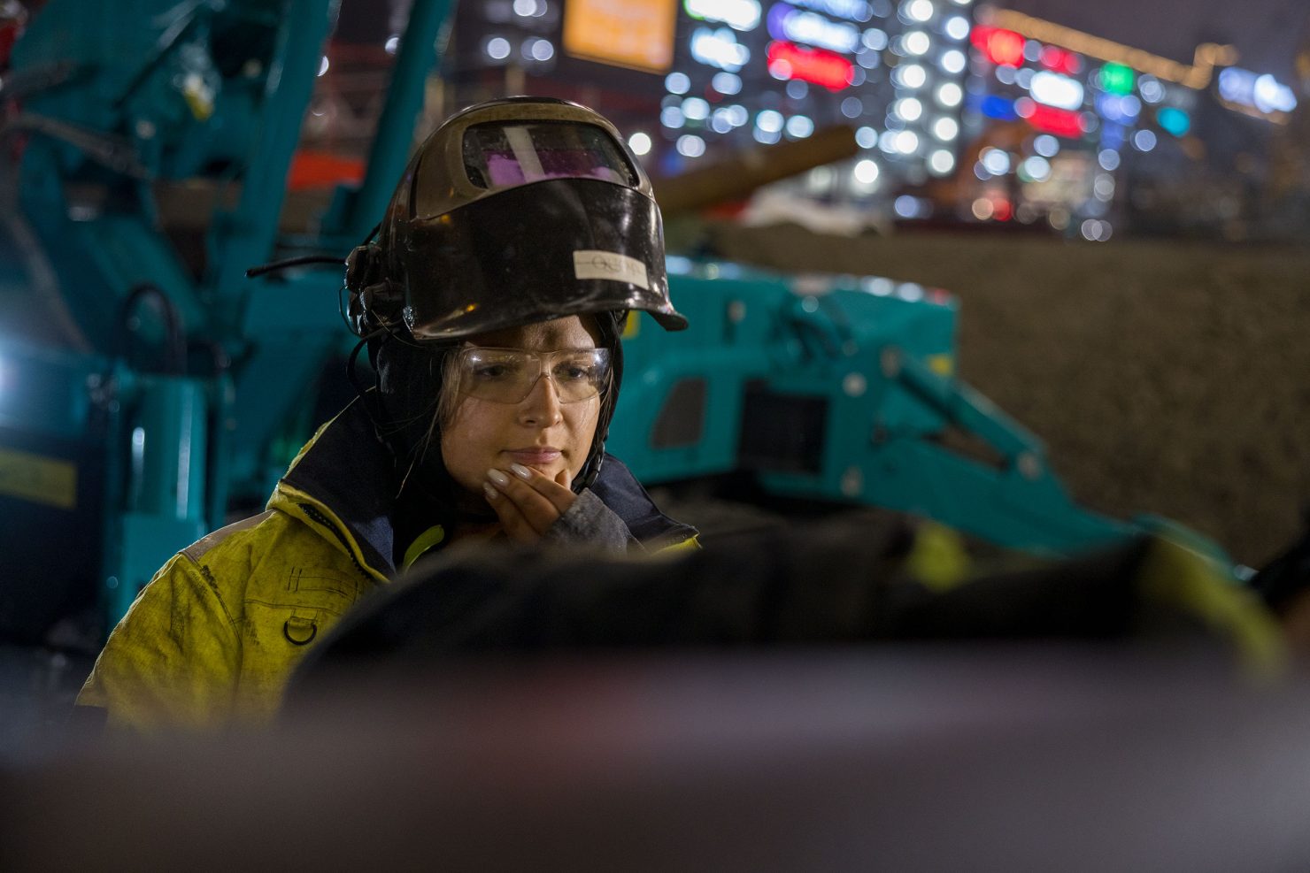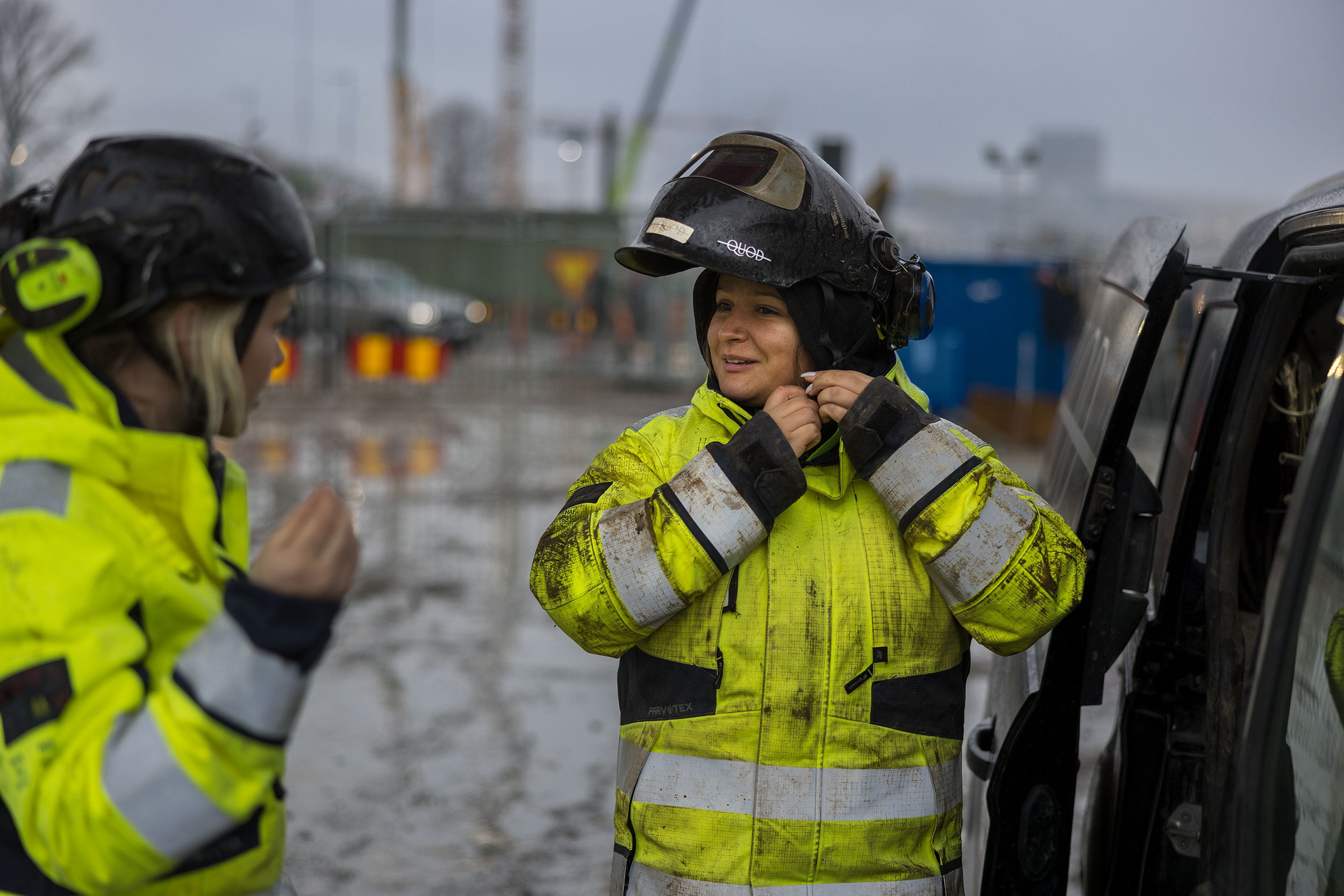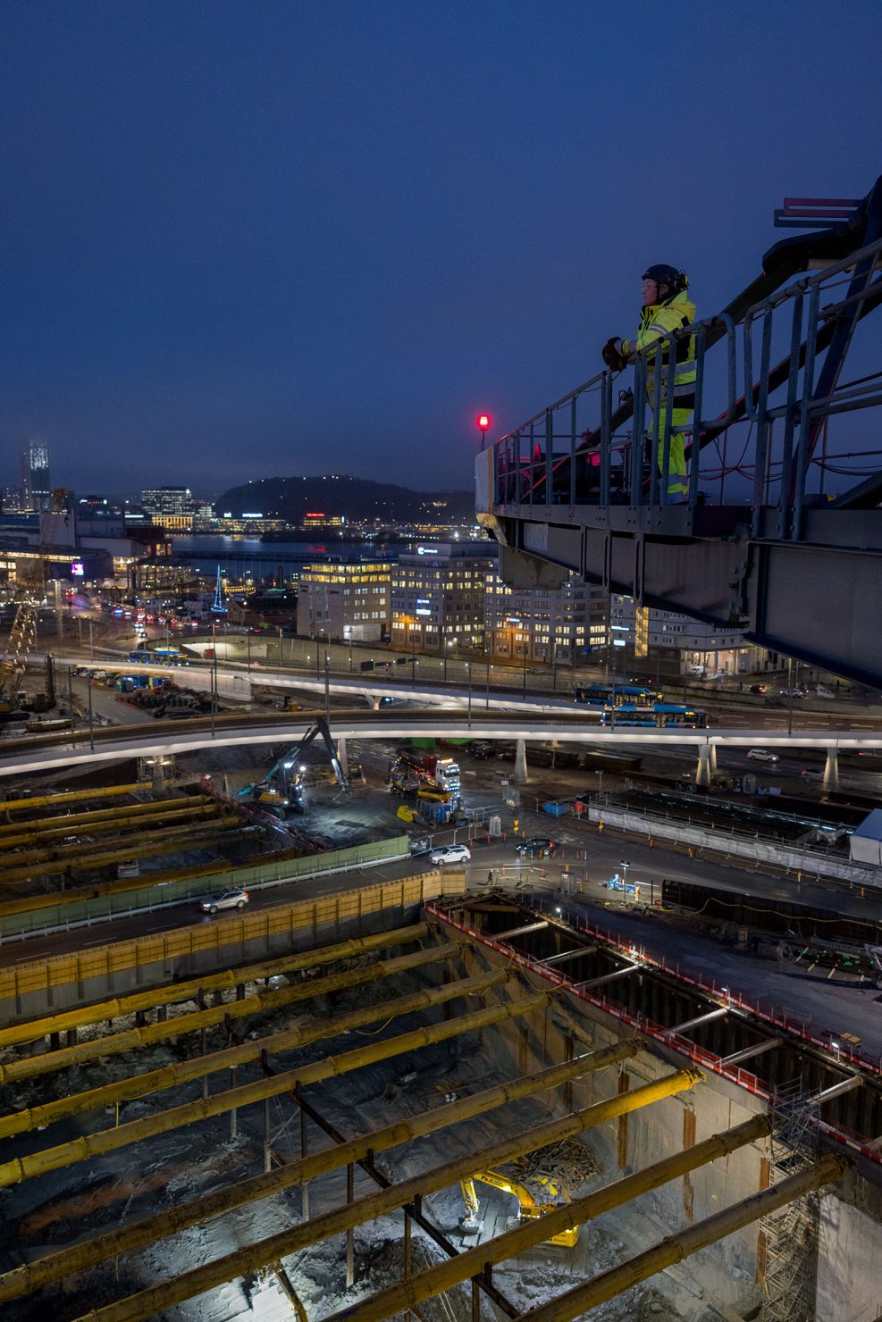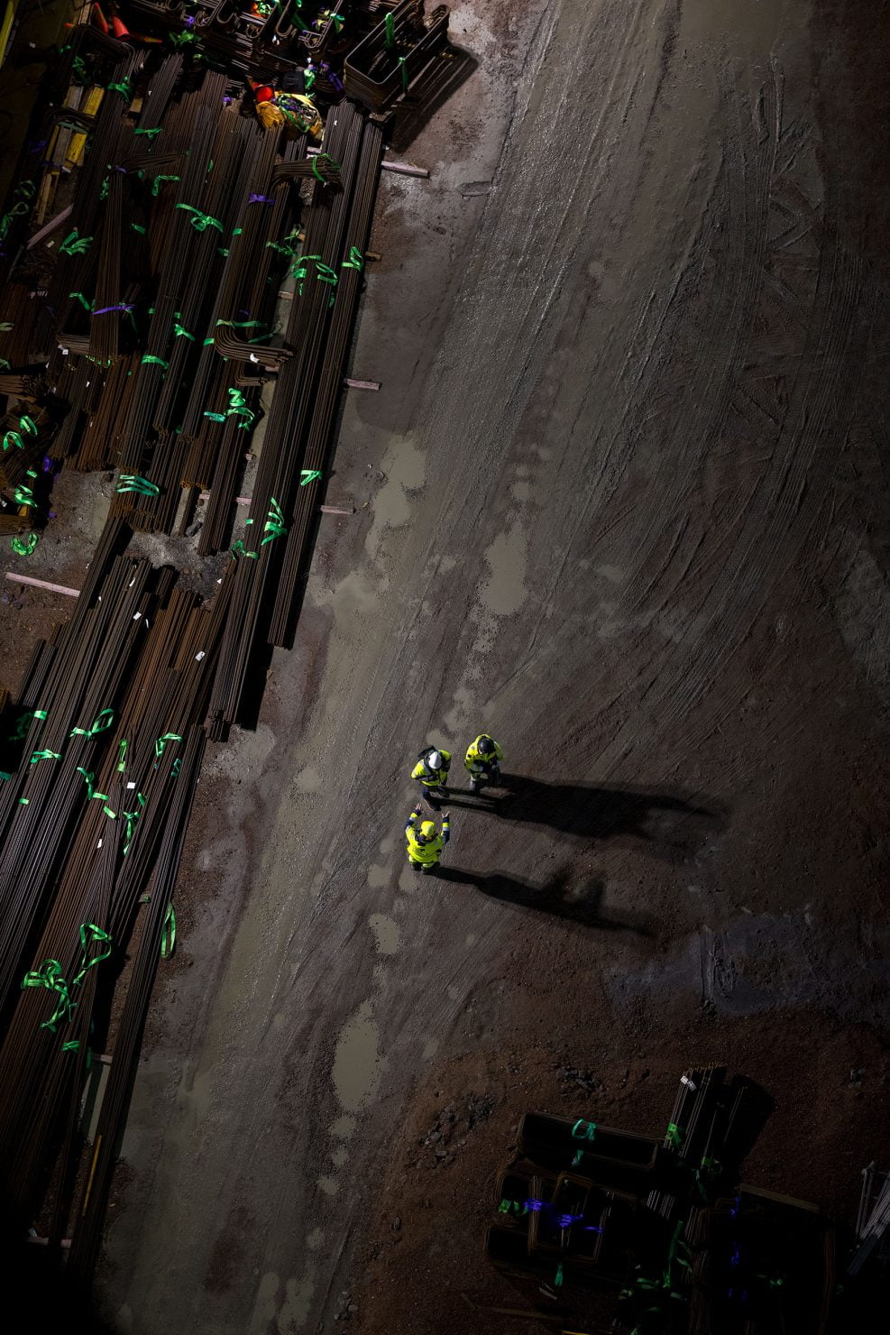 Matkalla tämän jättimäisen rakennustyömaan läpi he ohittavat kaivinkoneita, suuria nostureita ja rakennustyöntekijöitä, jotka ovat pukeutuneet huomiovaatteisiin.