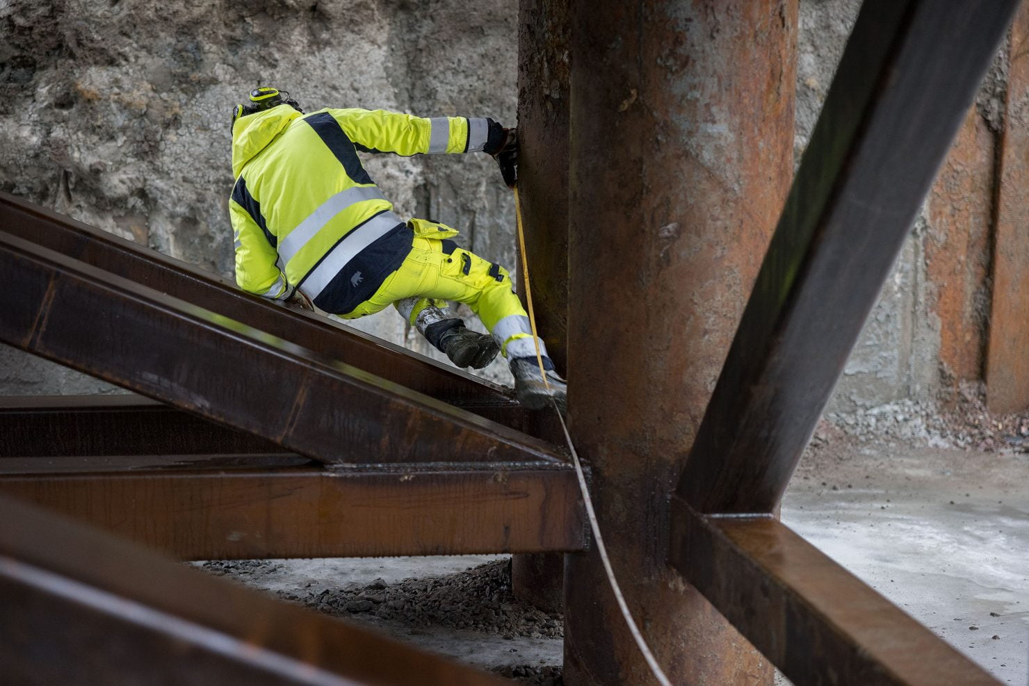 Tänään he asentavat yhdysparruja ja vinotukia. Heitä avustaa kaivinkoneen kuljettaja, joka nostaa raskaan putkituen maasta. Kun kaivinkone pitää yhdysparrua paikallaan, hitsaajat kiinnittävät sen paalutukseen.